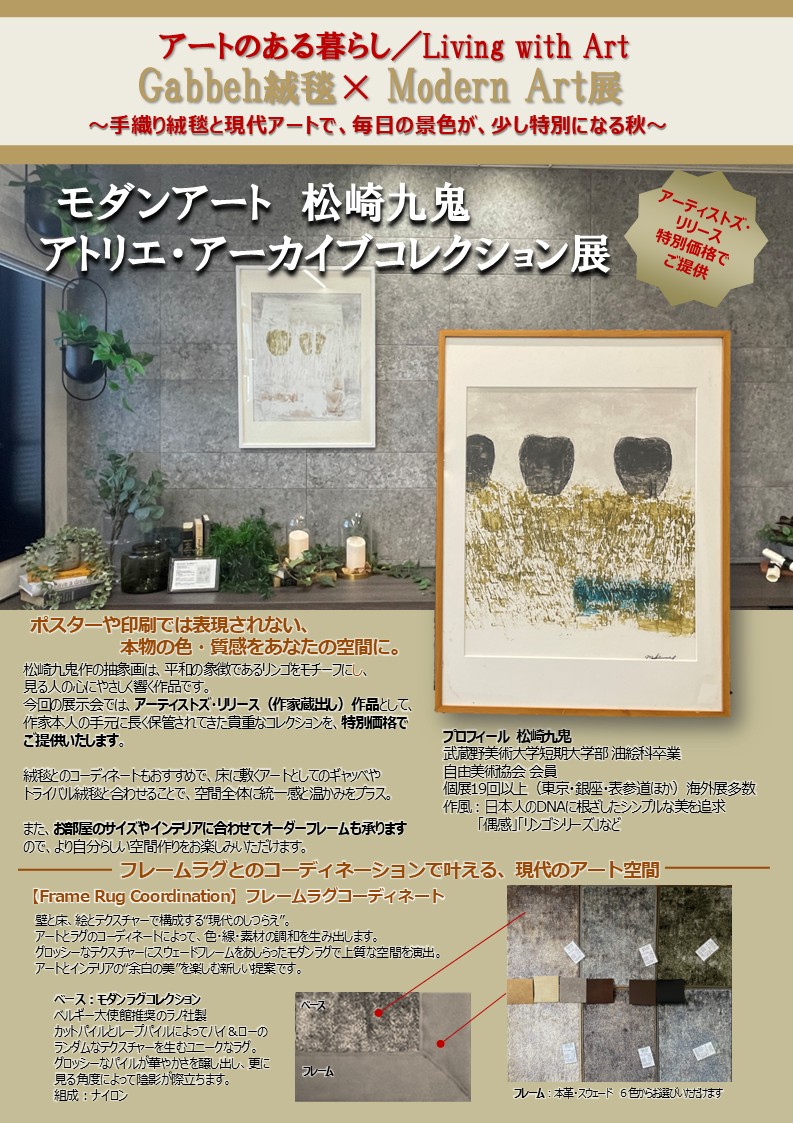 抽象画家・松崎九鬼による現代アート作品を展示販売。 平和の象徴をモチーフにした代表作をはじめ、作家のアトリエに眠る貴重な作品が並びます。 会場では「カスタム額装」や「フレームラグコーディネート」の提案も同時開催。 アートとインテリアが響き合う、“現代のしつらえ”をご紹介します。