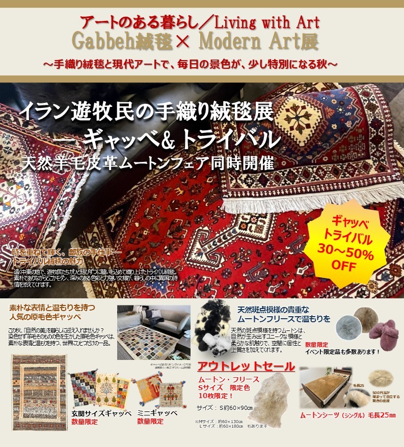 このたびの「アートのある暮らし展」では、イラン遊牧民の手織り絨毯・ギャッベとトライバル、そして現代アートの世界を同時にお楽しみいただけます