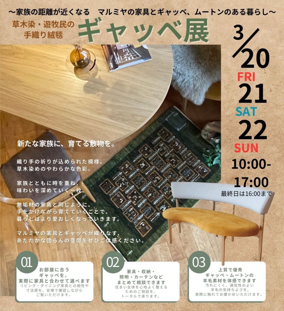 🐑家具とギャッベでつくる、心地よい暮らし展🐑このたび、静岡の家具メーカー「マルミヤ」ショウルームにて、家具とギャッベの展示販売会を開催いたします 開催日:2026年3月20日(金・祝)~3月22日(日)3日間開催時間:10:00~17:00(最終日は16:00ま...